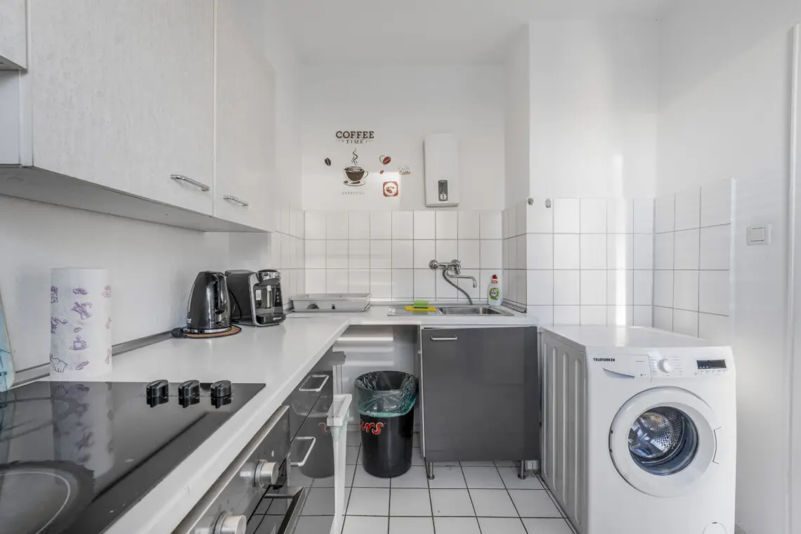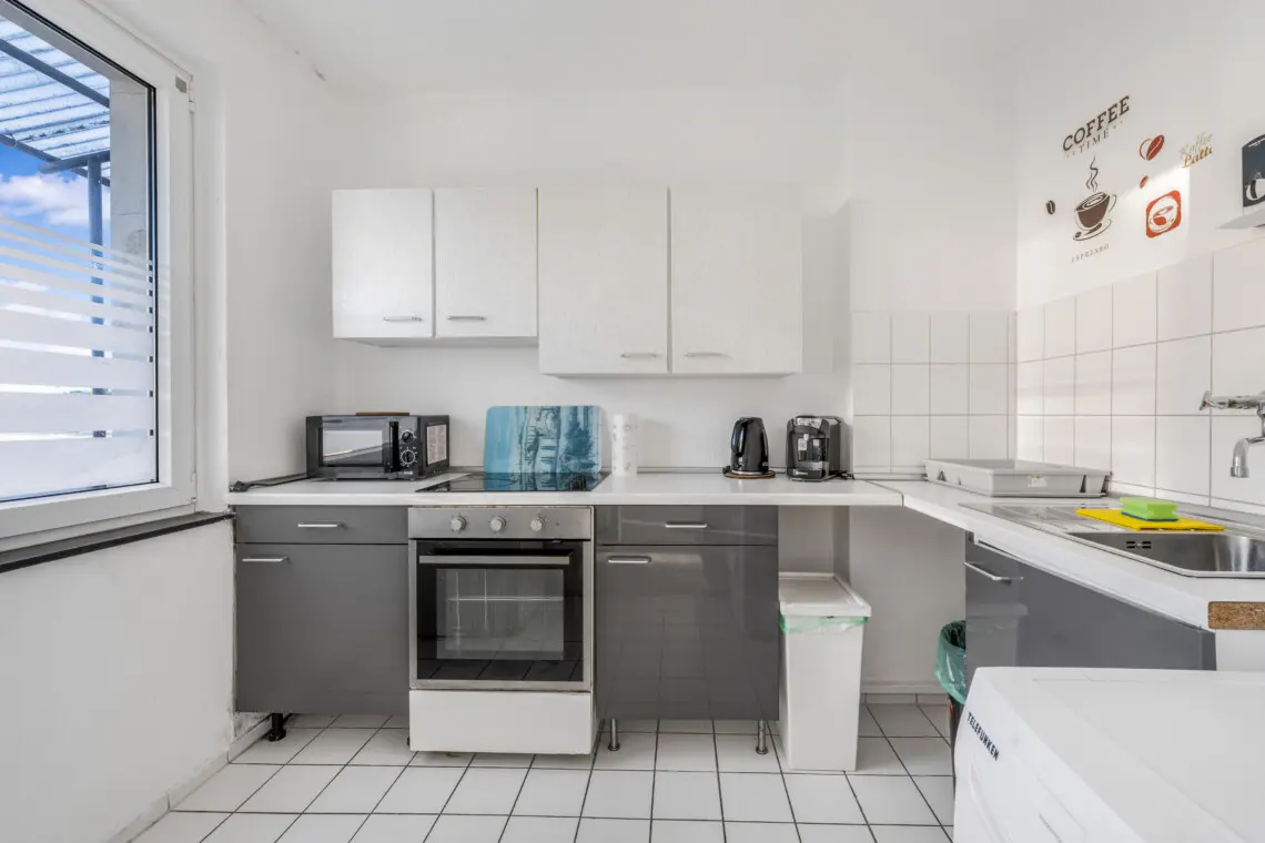 ⇒ Küche – ausgestattet- Essecke, Kaffeemaschine, Geschirr, Tiefkühler, Wasserkocher, Mikrowelle, Backofen, Kühlschrank und Herd